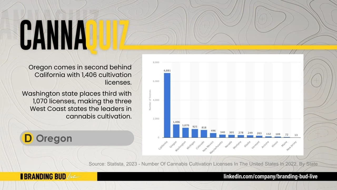 Right. This has to do with cultivation licenses. And the question is California has the most cultivation licenses of any state with 6,881? Which state holds the second spot with 1,406? Is it A Washington, B Colorado, C Oklahoma or D Oregon?